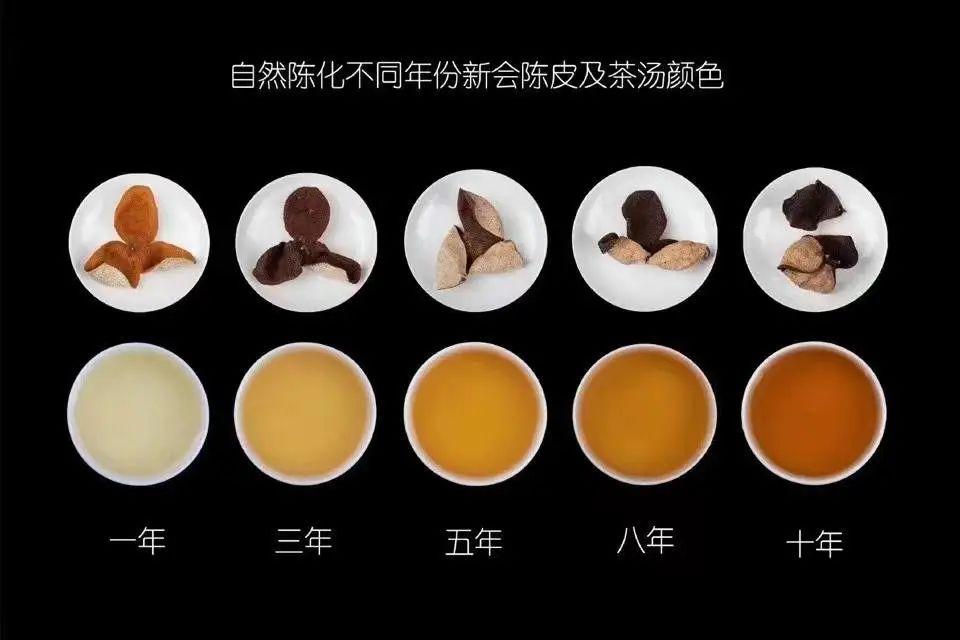 3.通過聞、品味道判斷——陳皮的香氣滋味由年份低到高的變化趨勢是:辛、澀、痹、雜刺激——甘、香、醇、陳。不符合這個規(guī)律的,往往就是拔高了年份;比如,一份標示20年的陳皮,卻表現(xiàn)出柑味,或辛、澀、痹、雜、刺激的特點,基本可以認為是假年份。