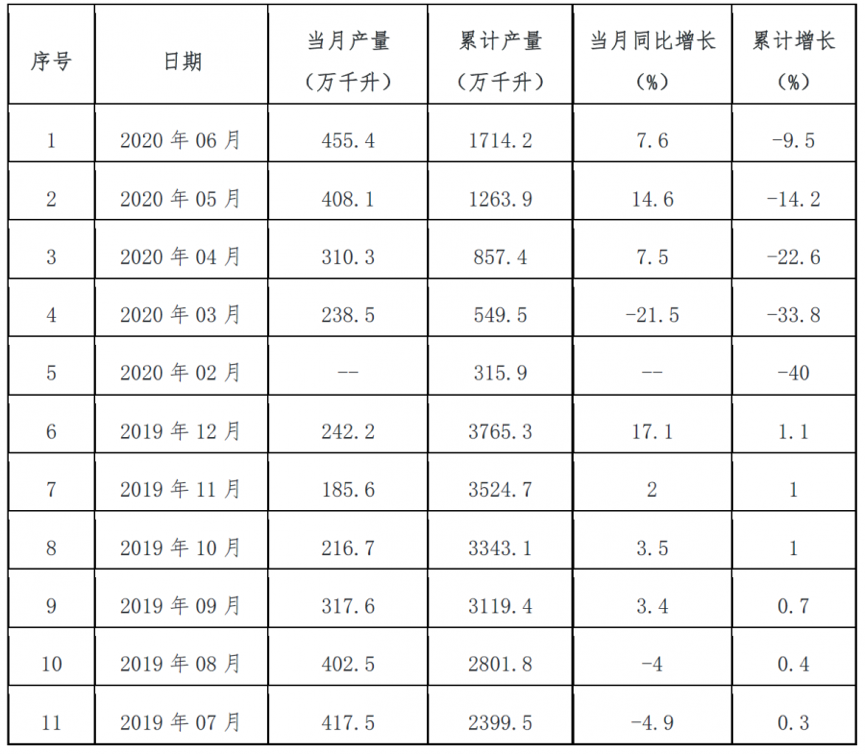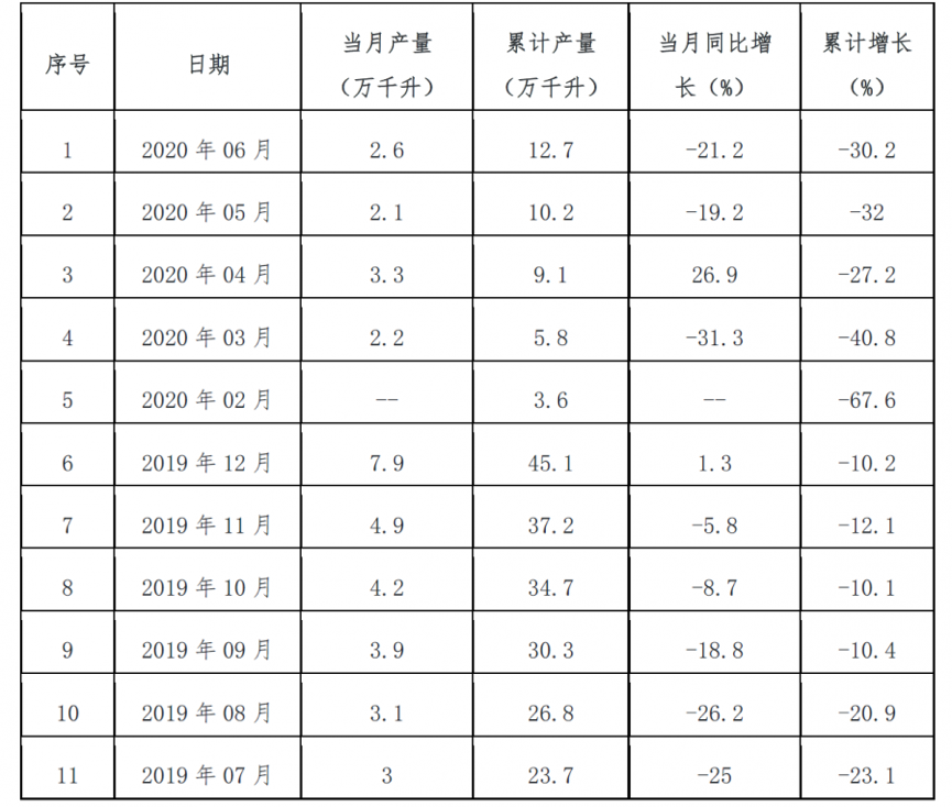 2020年1-6月我國白酒(折65度,商品量)產量為350.1萬千升,同比下降8.6%;進口金額為3858.1萬美元,同比下降32.9%;出口金額為24844.1萬美元,同比下降18.9%。