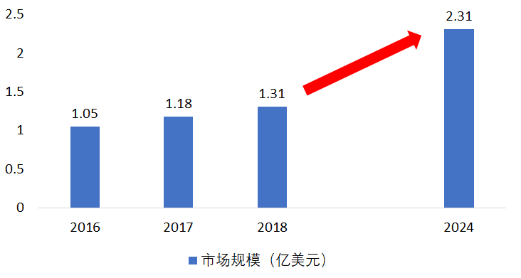 消費電子領域是半導體熱電器件的重要實際應用方向。2016年至2018年,半導體熱電器件在消費電子產品應用領域的銷售市場規模分別為1.05億美元、1.18億美元、1.31億美元,預計2024年將達到2.31億美元。